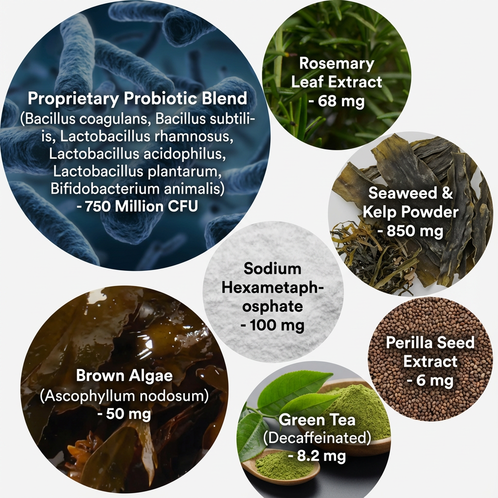 Our BioClean+™ formula combines ocean minerals (seaweed, kelp) with 750 million CFU of probiotics to address bad breath at the source — the gut. Plus we include Sodium Hexametaphosphate, a vet-grade tartar blocker most brands skip because it's expensive.